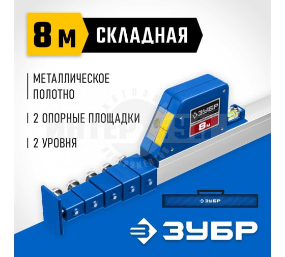 Телескопическая линейка ЗУБР, предназначена для точных измерений линейных размеров между элементами конструкций при выполнении строительных работ. Профессиональный инструмент для сложных измерений крупных объектов. Телескопическая конструкция.Тип линейка телескопическая Длина (мм) 8000 мм Материал металл -